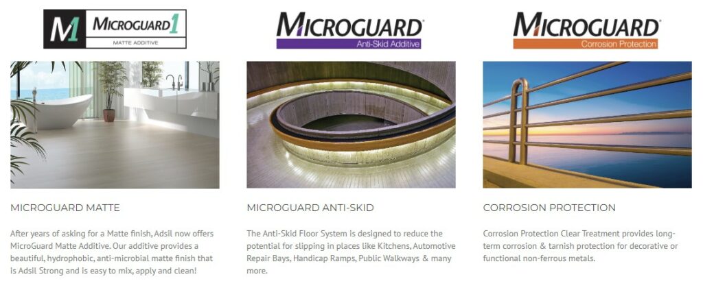 Adsil manufactures several MicroGuard® products that can be applied onto bare concrete or other masonry surfaces, such as brick, pavers, decorative stone, stucco or concrete/polymer blends. These product finishes can be used for either interior or exterior surfaces and Adsil has designed products for both horizontal and vertical applications.